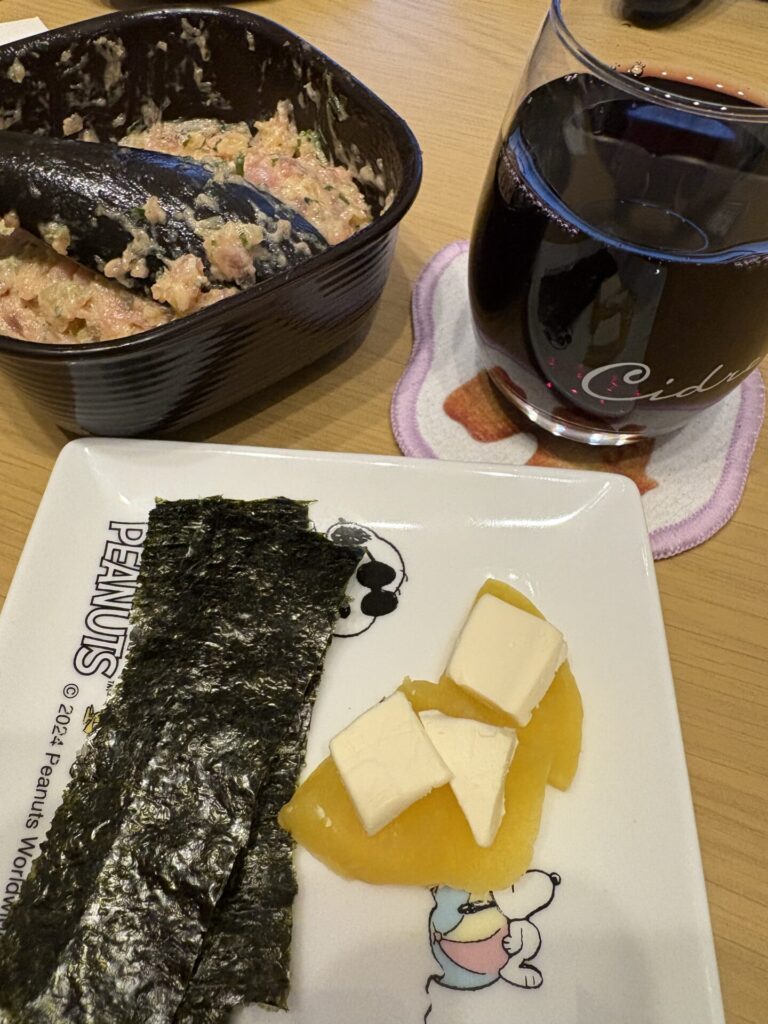 おつまみにはポテトグラタン、カニカマの唐揚げ、トロたく、たくあんのクリームチーズ乗せ。どれもお酒が進む。
