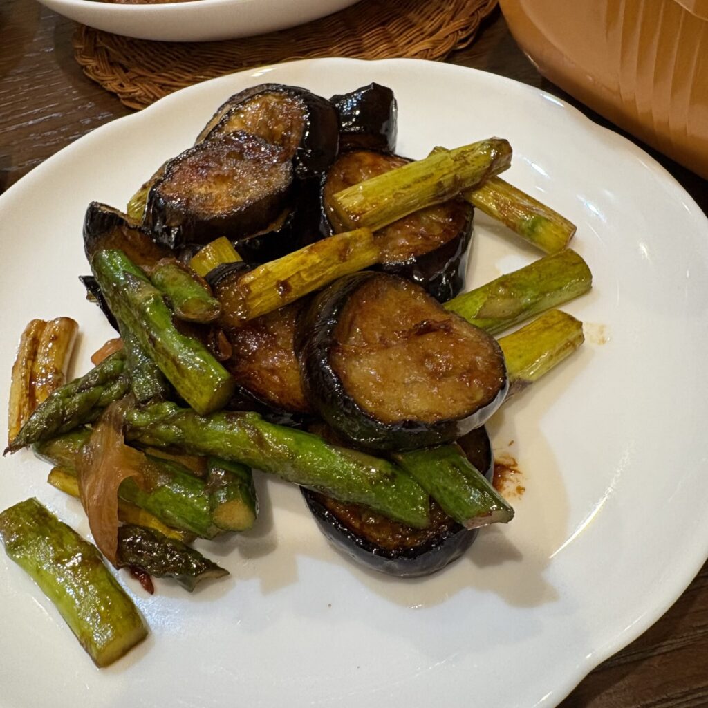 ナスとアスパラガスのオイスター炒め(ガリ入り)